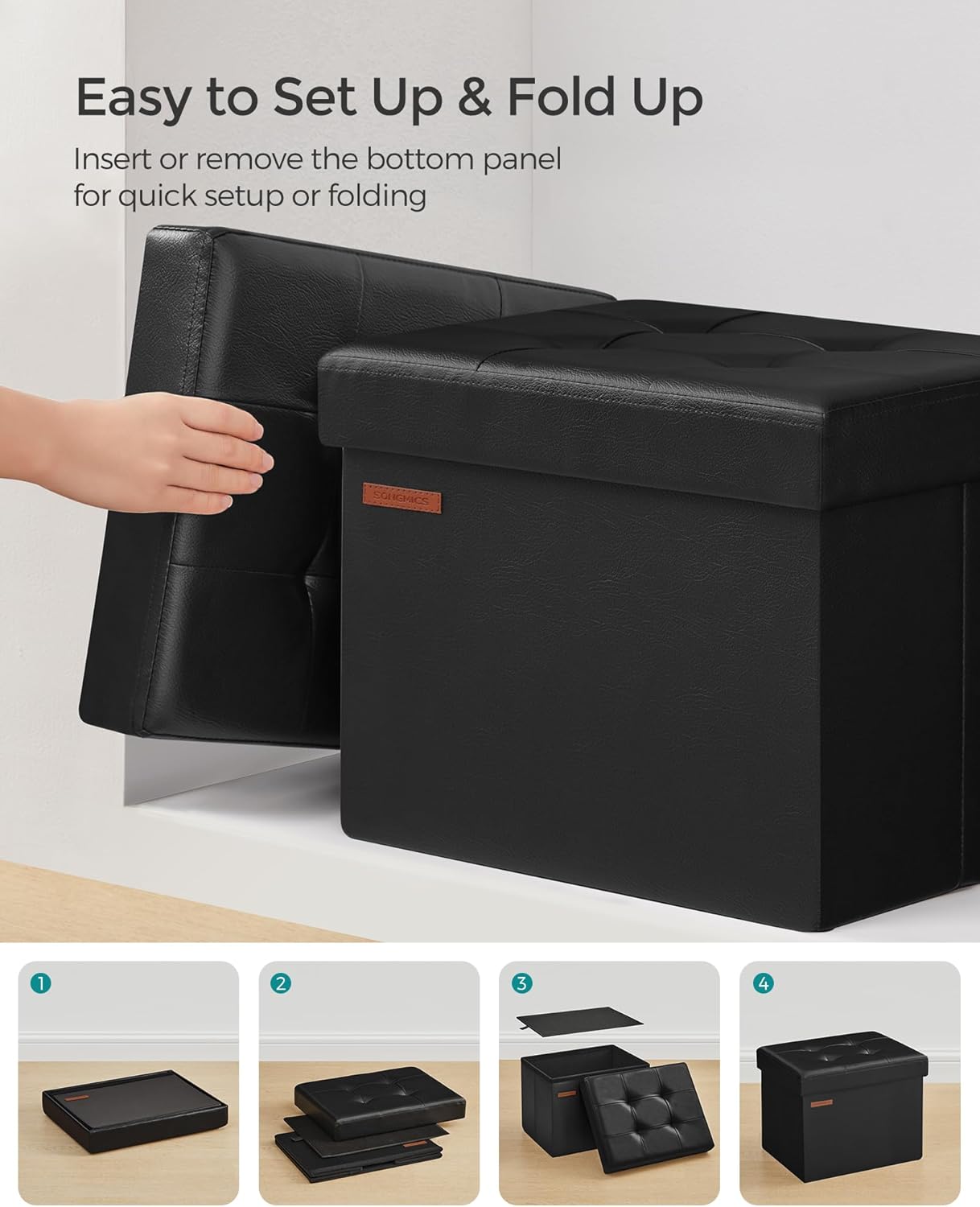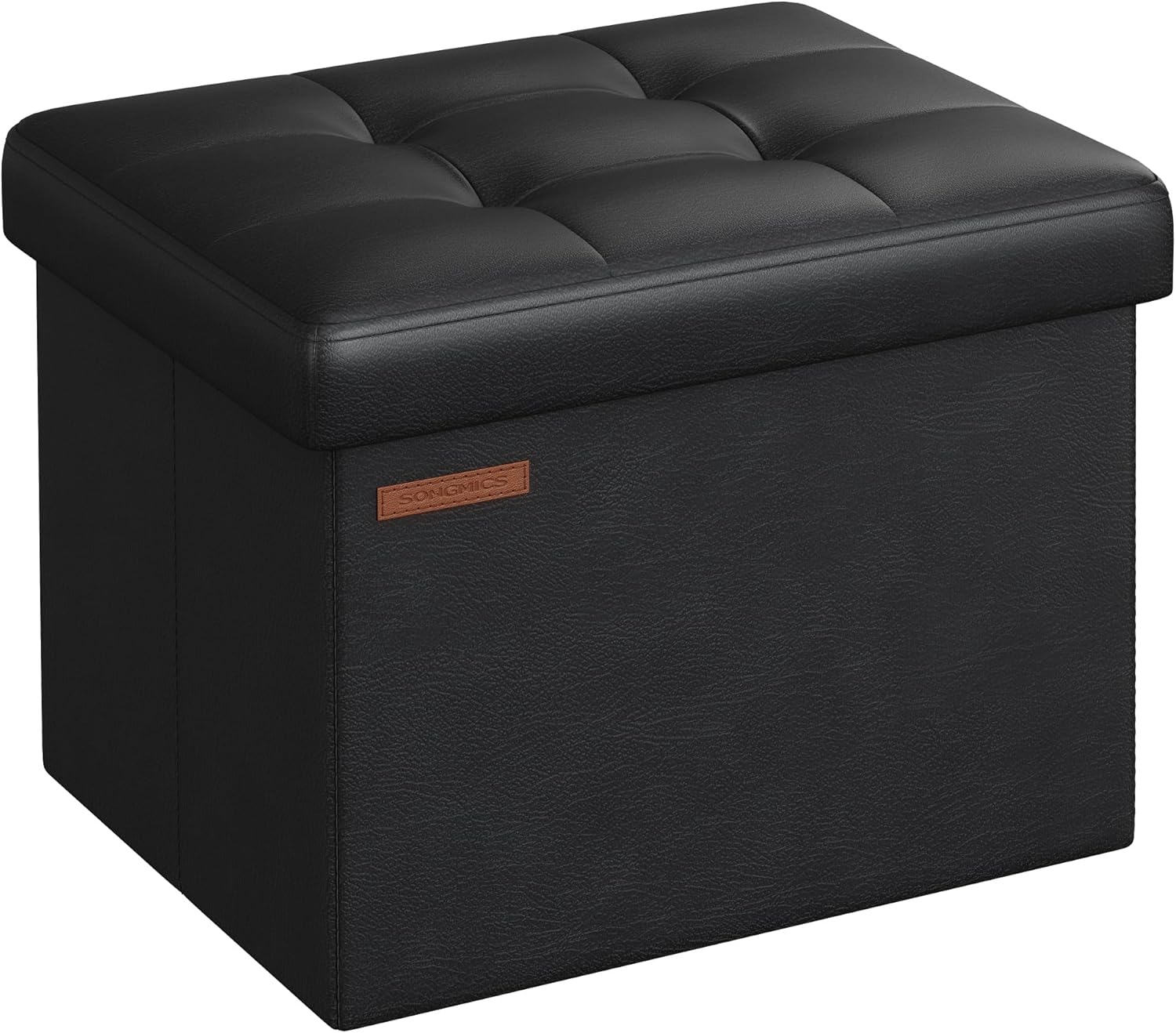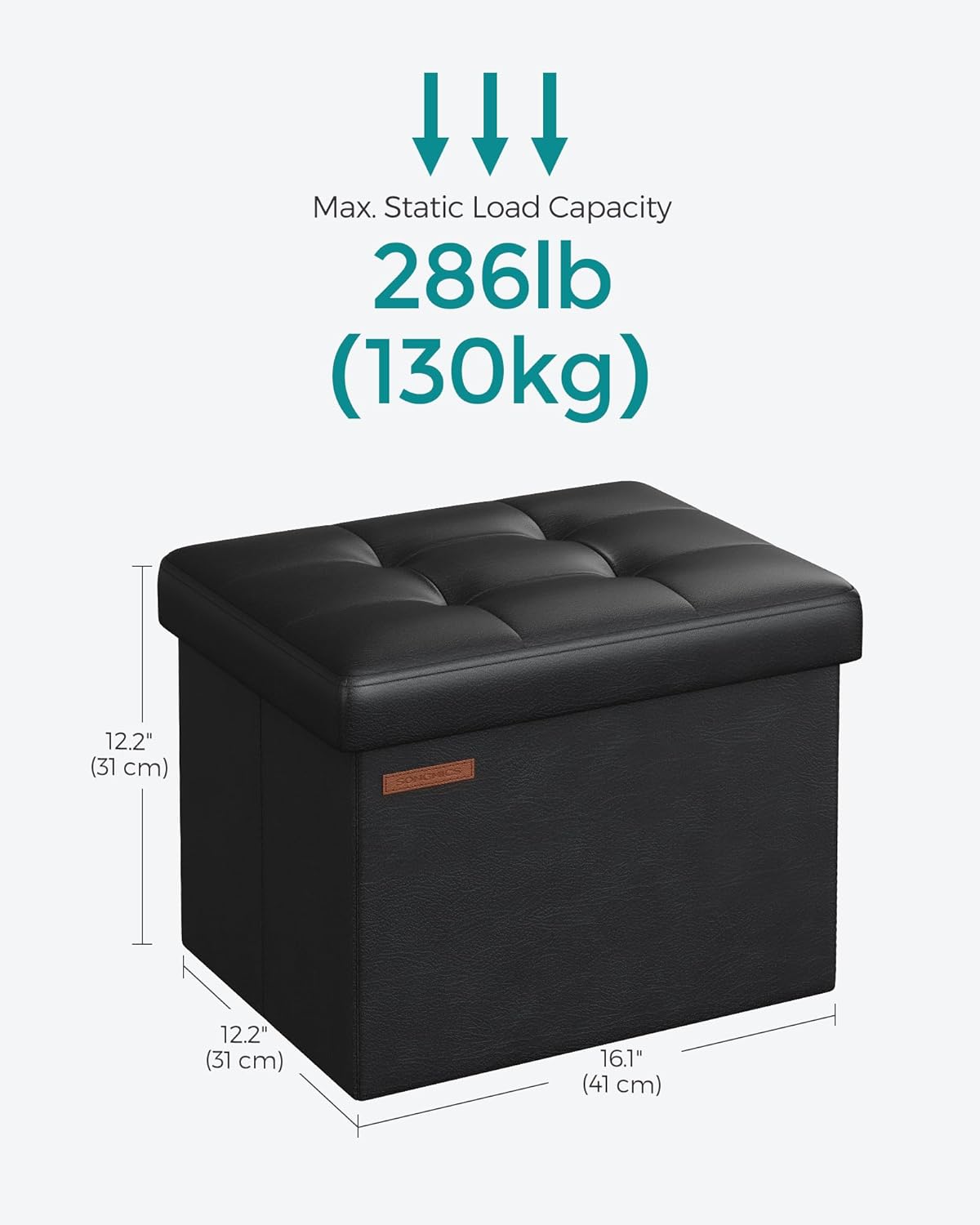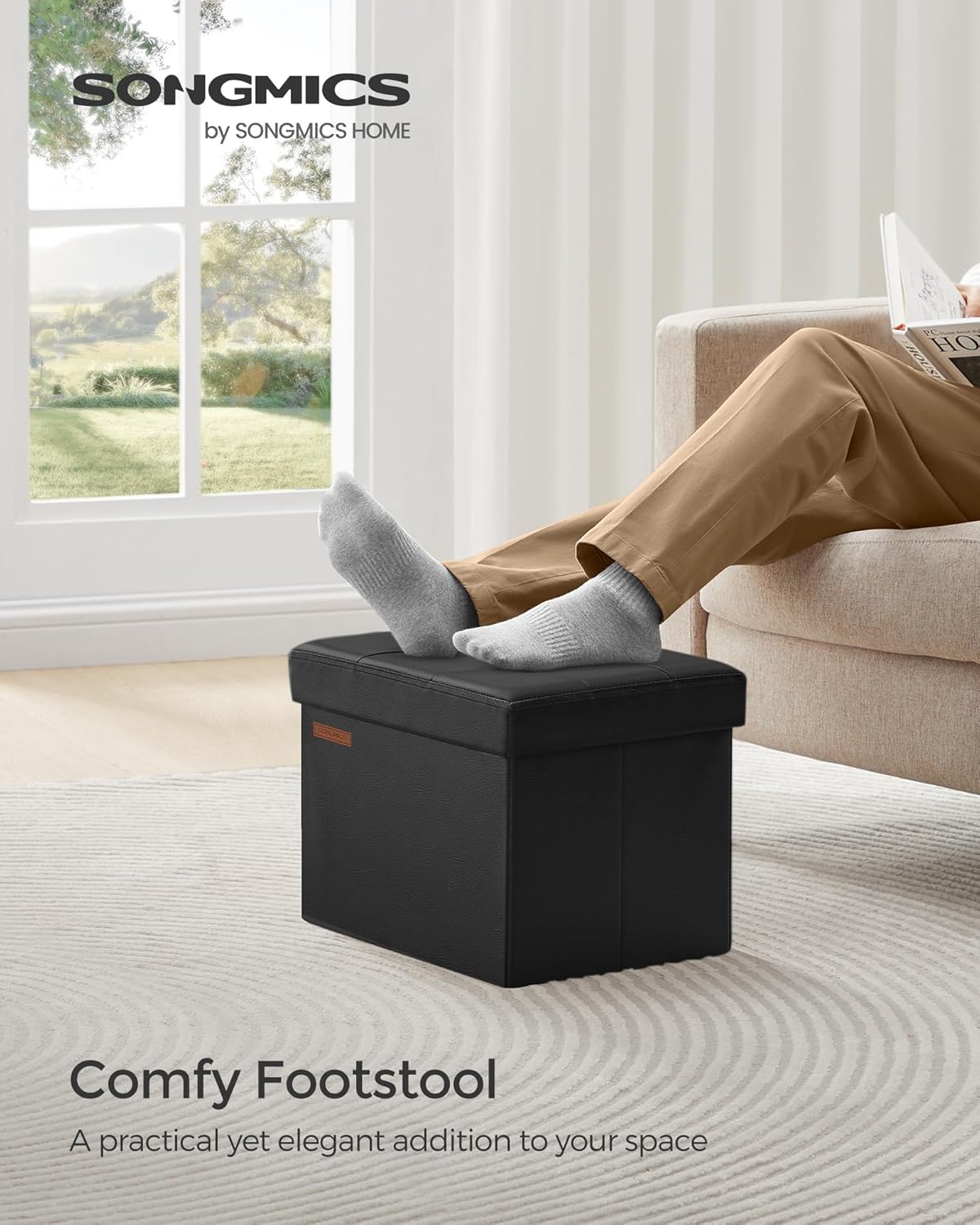 SONGMICS Small Folding Storage Ottoman, Foot Rest Stool, Cube Footrest, Synthetic Leather, 12.2 x 16.1 x 12.2 Inches, 286 lb Capacity, for Living Room, Bedroom, Dorm, Ink Black ULSF100B01